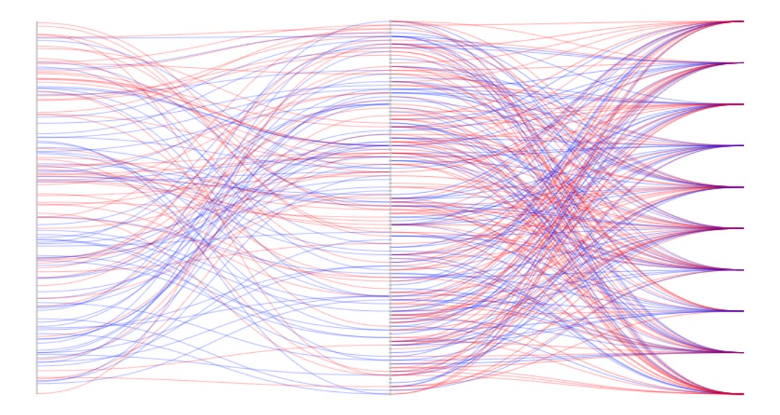 Rendering of the connections in our neural network. Inputs on the left side, the 10 outputs on the right. Both are connected through a middle layer that groups inputs in different combinations. These combinations are established through training and help to detect visual patterns.